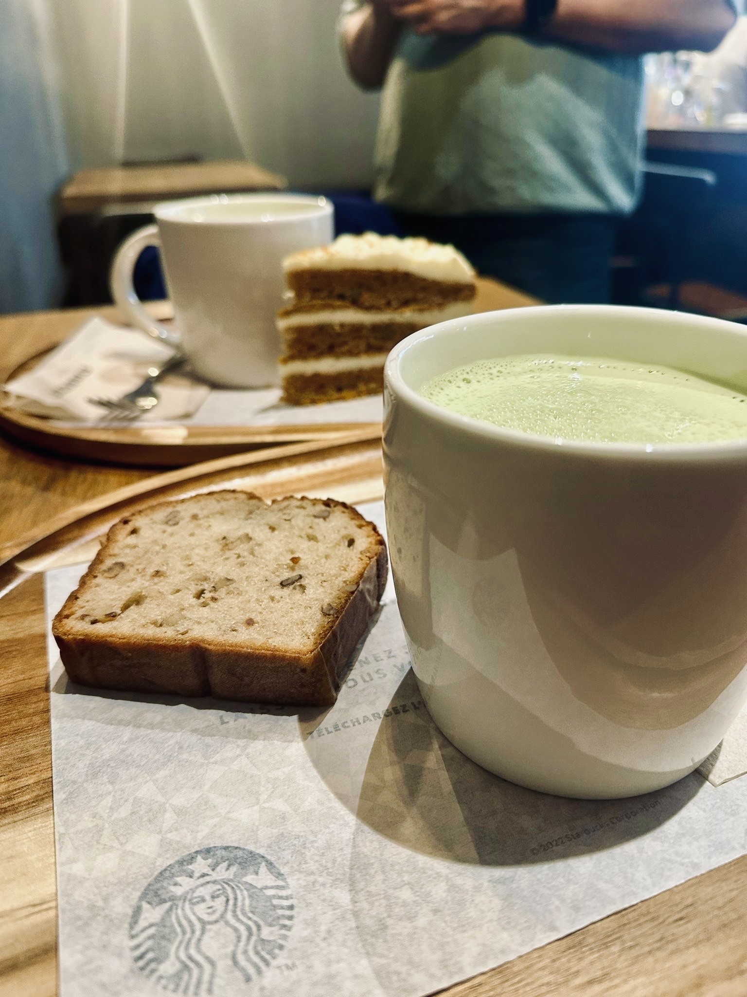 Avis de mon père : Café okay. Pâtisserie loin d’être fraîche. Avis de moi : Matcha soja glacé excellent.